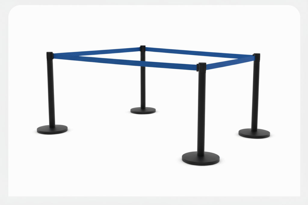 Los ordenadores separadores de filas pueden incluir cintas retráctiles o cadenas metálicas. Son ideales para controlar el flujo de personas de manera ordenada y visualmente clara.